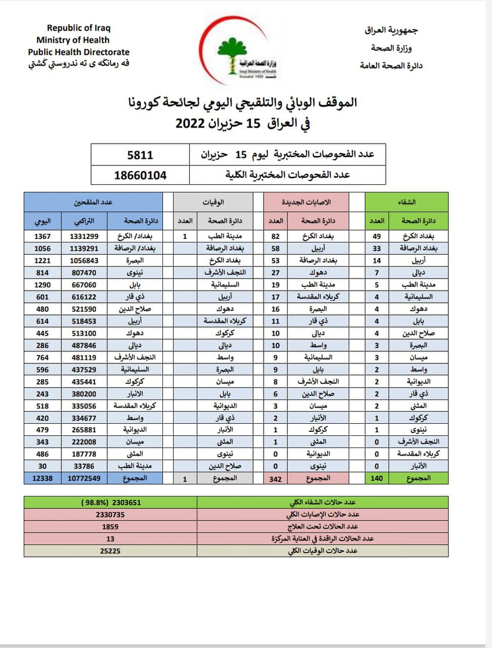 أعلنت وزارة الصحة، اليوم الاربعاء، الموقف الوبائي اليومي الخاص بجائحة كورونا في عموم العراق.