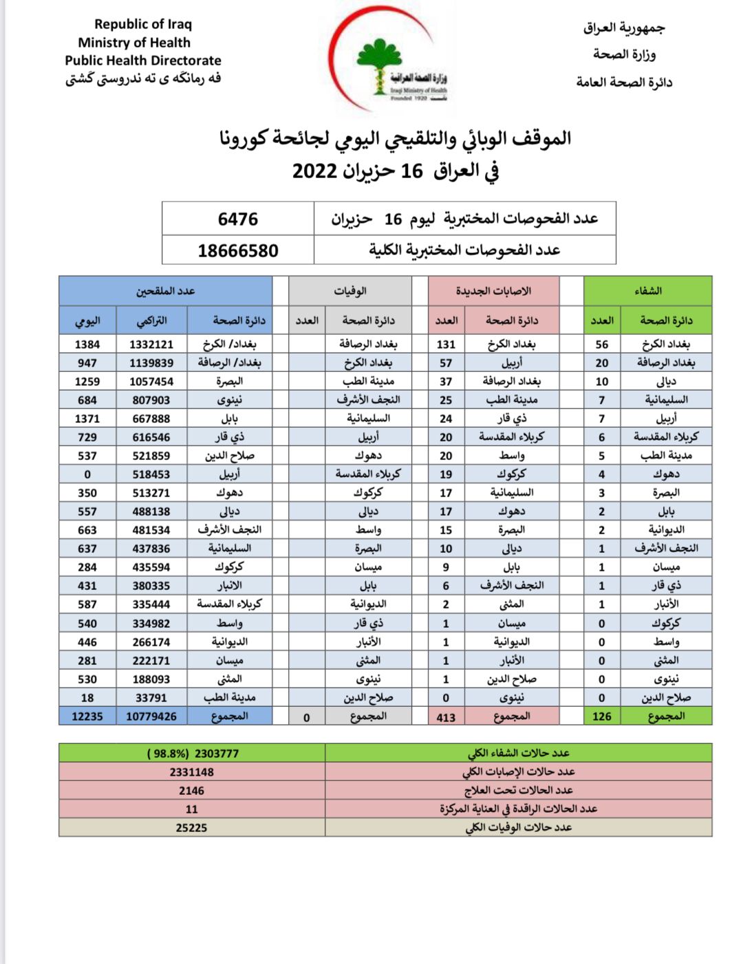 أعلنت وزارة الصحة، اليوم الخميس، الموقف الوبائي والتلقيحي لجائحة كورونا في العراق.