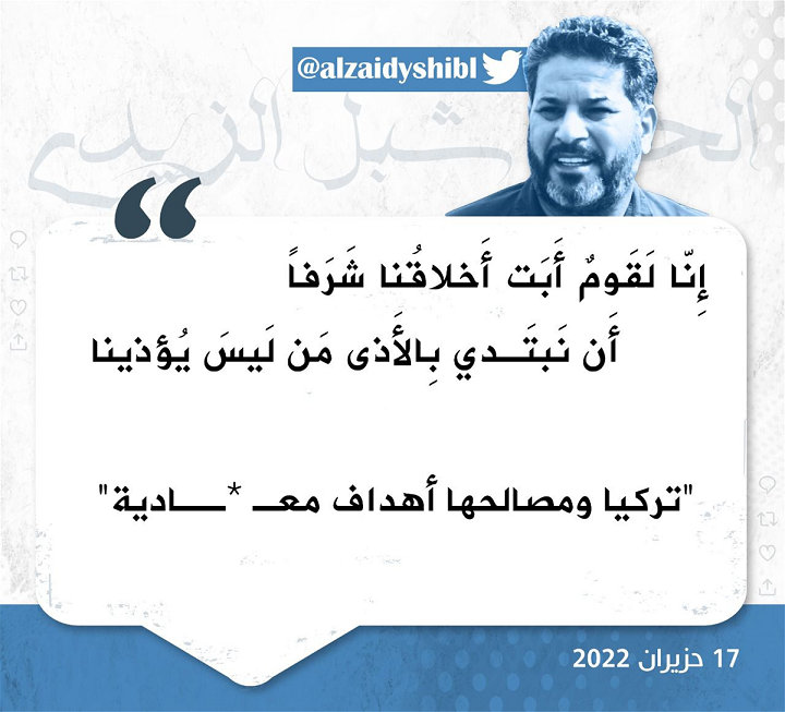 وقال الزيدي في تغريدة عبر تويتر، ، "إنا لقوم أبت أخلاقنا شرفاً أن نبتدي بالأذى من ليس يؤذينا".