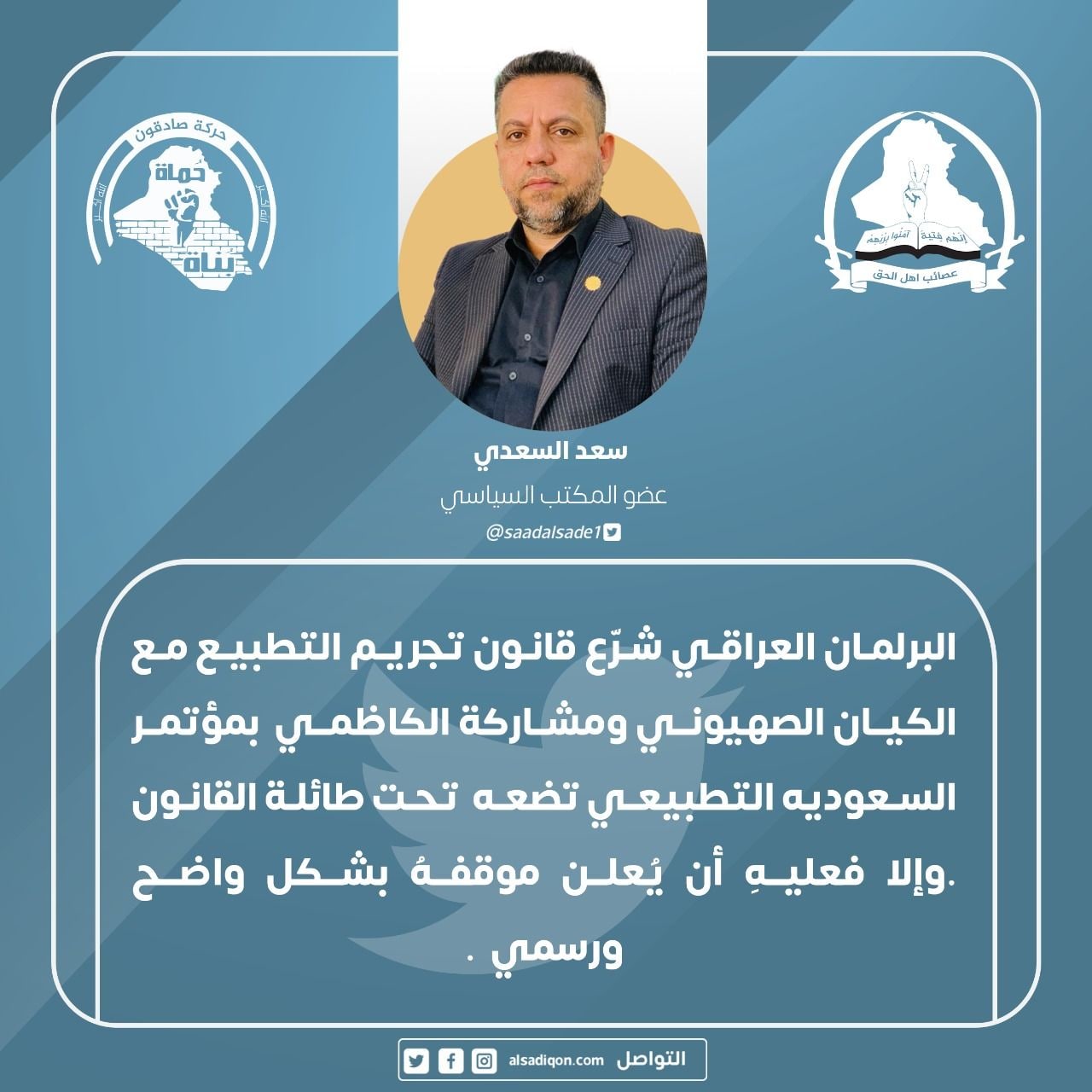 السعدي: مشاركة الكاظمي في مؤتمر السعودية التطبيعي تضعه تحت طائلة القانون