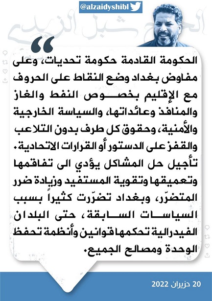وقال الزيدي في بيان، إن "الحكومة القادمة حكومة تحديات"، مشيراً الى أن "البلدان الفيدرالية تحكمها قوانين وأنظمة تحفظ الوحدة ومصالح الجميع".