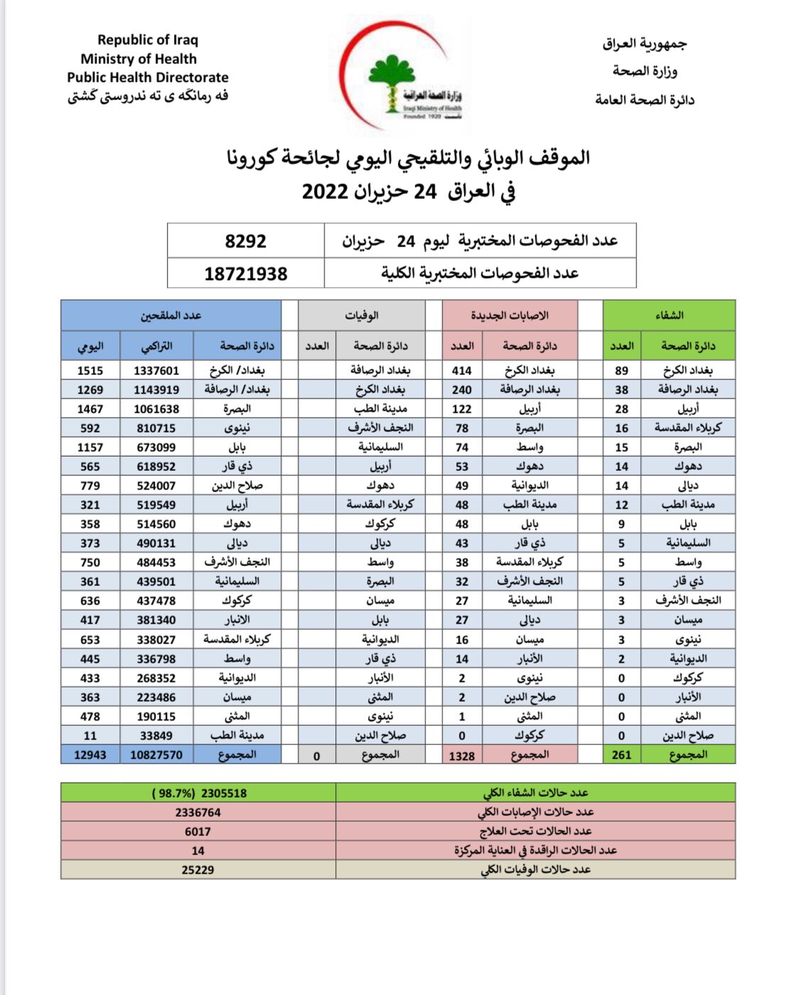 أعلنت وزارة الصحة، اليوم الجمعة، الموقف الوبائي والتلقيحي اليومي لجائحة كورونا في العراق.