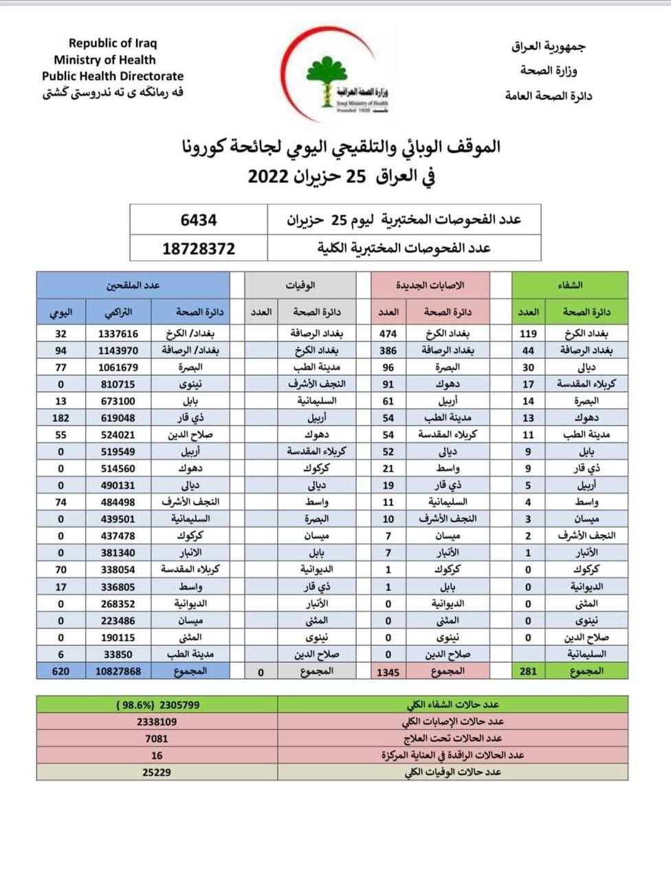 أعلنت وزارة الصحة، اليوم السبت، الموقف الوبائي والتلقيحي اليومي لجائحة كورونا في العراق.