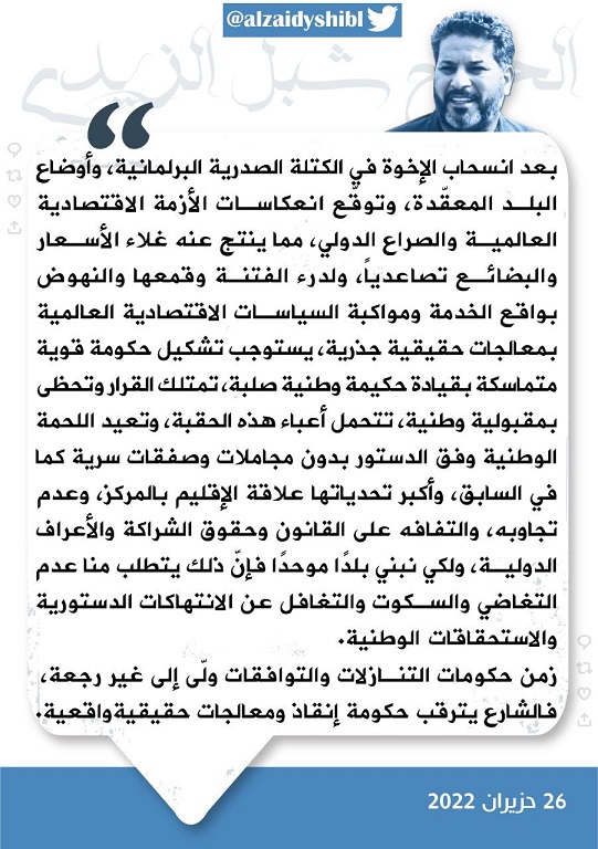 وقال الزيدي في تغريدة عبر تويتر، ، إن "الوضع الحالي يستوجب تشكيل حكومة قوية متماسكة بقيادة حكيمة وطنية صلبة تتحمل أعباء هذه الحقبة".