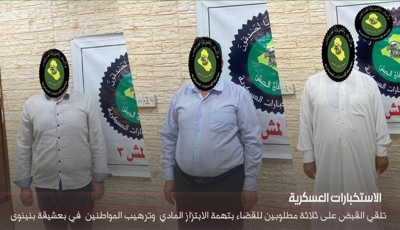 ألقت مفارز مديرية الاستخبارات العسكرية القبض على ثلاثة مطلوبين للقضاء بتهمة الابتزاز المادي وترهيب المواطنين في قضاء بعشيقة في محافظة نينوى.