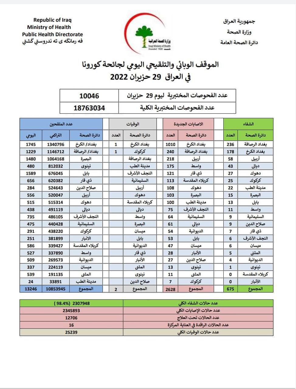 اعلنت وزارة الصحة اليوم الاربعاء، تسجيل 2628 إصابة جديدة بفيروس كورونا.