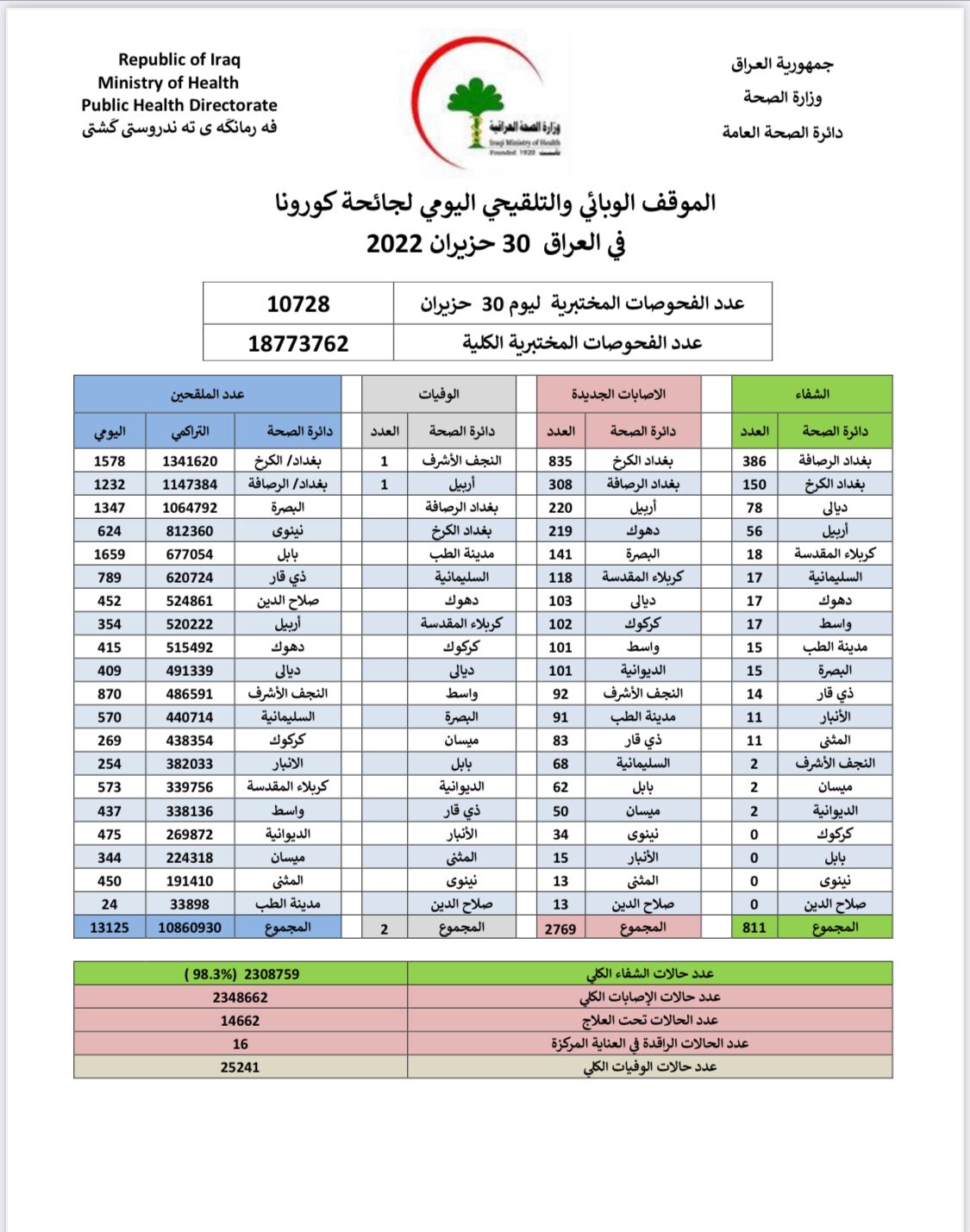أعلنت وزارة الصحة، اليوم الخميس، الموقف الوبائي والتلقيحي لجائحة كورونا في العراق.