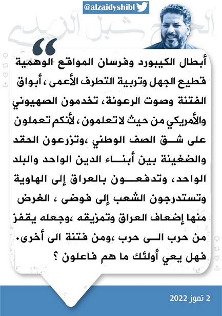 وقال الزيدي في تغريدة عبر تويتر، إن "أبطال الكيبورد وفرسان المواقع الوهمية قطيع الجهل وتربية التطرف الاعمى، أبواق الفتنة وصوت الرعونة، تخدمون الصهيوني والأمريكي من حيث لا تعلمون، لأنكم تعملون على شق الصف الوطني، وتزرعون الحقد والضغينة بين أبناء الدين الواحد والبلد الواحد، وتدفعون بالعراق إلى الهاوية وتستدرجون الشعب إلى فوضى الغرض منها إضعاف العراق وتمزيقه وجعله يقفز من حرب إلى حرب ومن فتنة إلى أخرى".