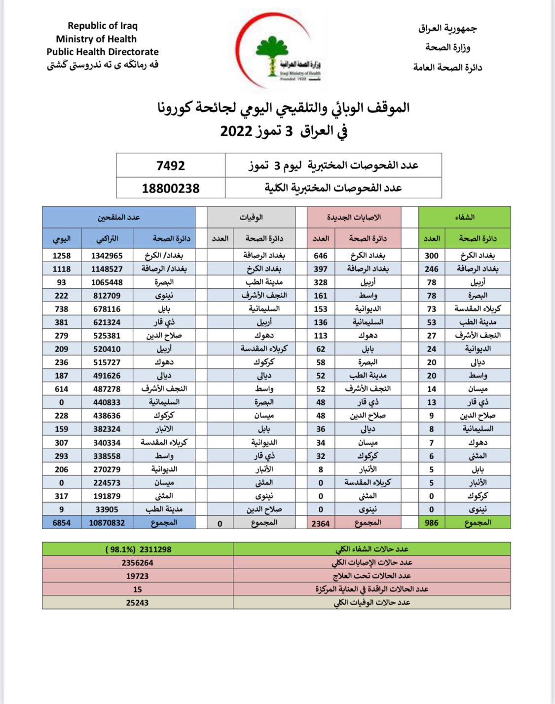 أعلنت وزارة الصحة، اليوم الأحد، الموقف الوبائي والتلقيحي اليومي لجائحة كورونا في العراق.