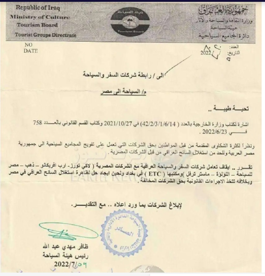 وذكرت وثيقة انه “تقرر ايقاف تعامل شركات السفر والسياحة العراقية مع الشركات المصرية ( لاكي تورز- ارب افريكانو – ذهب – مصر للسياحة – اللؤلؤة – ماستر ترفل ) ومكتبها في بغداد ولحين ايجاد حل لظاهرة استغلال السائح العراقي في مصر