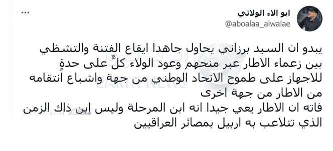 وكتب الولائي في تدوينة على منصة “تويتر “يبدو ان السيد بارزاني يحاول جاهدا ايقاع الفتنة والتشظي بين زعماء الاطار عبر منحهم وعود الولاء كلٌّ على حدةٍ للاجهاز على طموح الاتحاد الوطني من جهة واشباع انتقامه من الاطار من جهة اخرى”.
