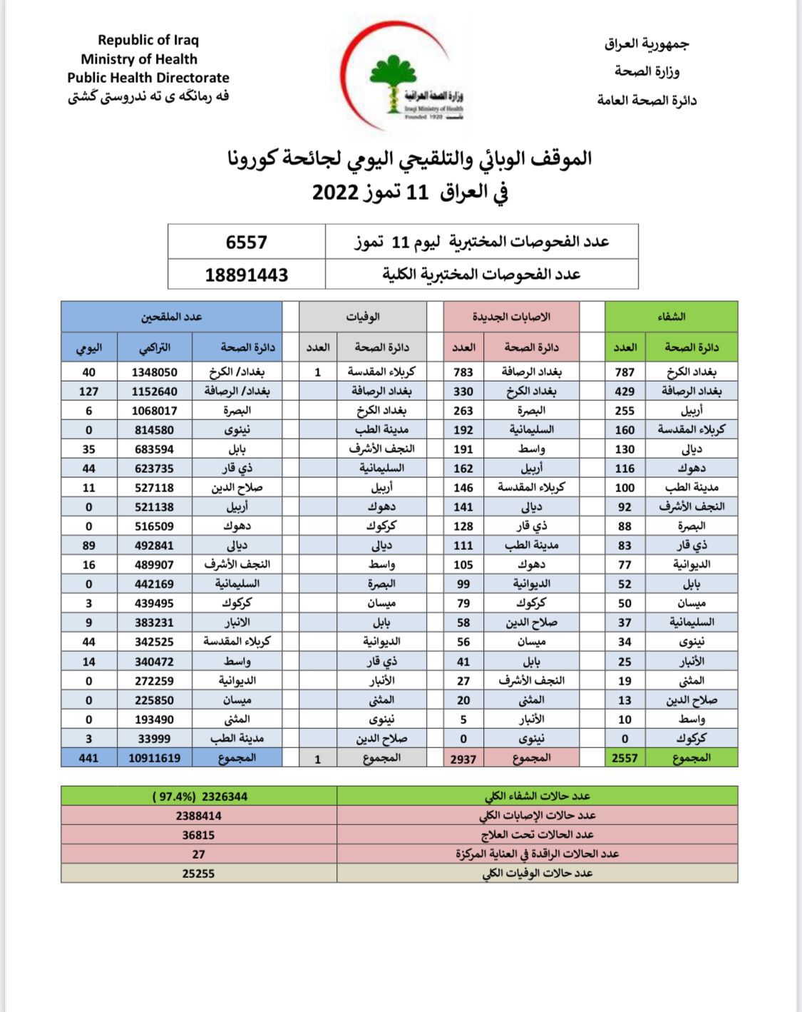 أعلنت وزارة الصحة، اليوم الاثنين، الموقف الوبائي والتلقيحي اليومي لجائحة كورونا في العراق.