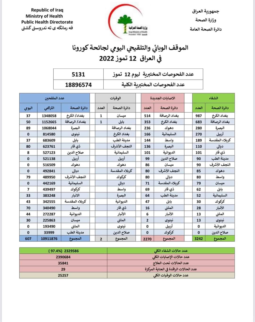 اعلنت وزارة الصحة، اليوم الثلاثاء، عن الموقف الوبائي والتلقيحي الخاص بجائحة كورونا في العراق خلال الـ24 ساعة الماضية.