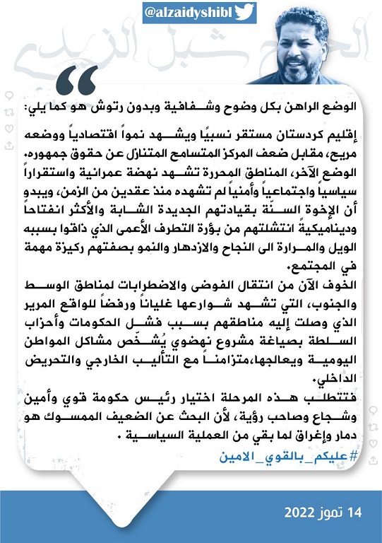 حذر الأمين العام لكتائب الإمام علي شبل الزيدي، اليوم الخميس، من انتقال الفوضى والاضطرابات لمناطق الوسط والجنوب، فيما اشار الى ان هذه المرحلة تتطلب اختيار رئيس حكومة قوي وأمين وشجاع وصاحب رؤية.