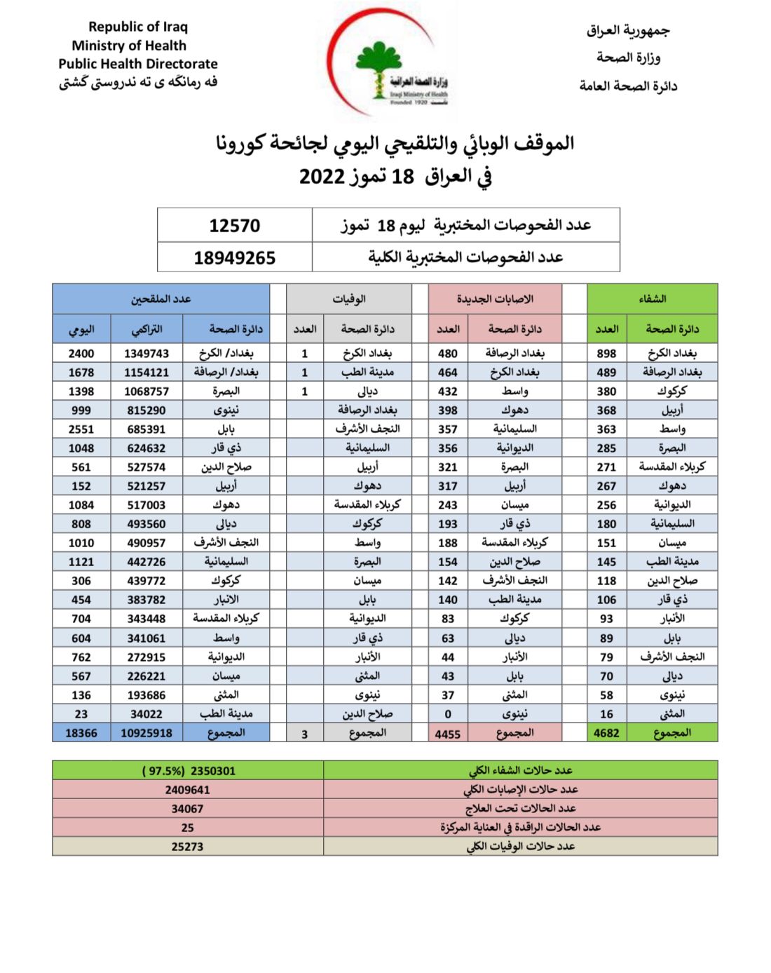 أعلنت وزارة الصحة، اليوم الاثنين، الموقف الوبائي اليومي لجائحة كورونا في عموم العراق.