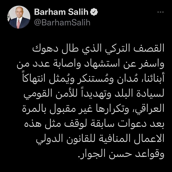 وقال صالح في تغريدة عبر تويتر إن "القصف التركي الذي طال دهوك واسفر عن استشهاد واصابة عدد من أبنائنا، مُدان ومُستنكر ويُمثل انتهاكاً لسيادة البلد وتهديداً للأمن القومي العراقي، وتكرارها غير مقبول بالمرة بعد دعوات سابقة لوقف مثل هذه الاعمال المنافية للقانون الدولي وقواعد حسن الجوار".