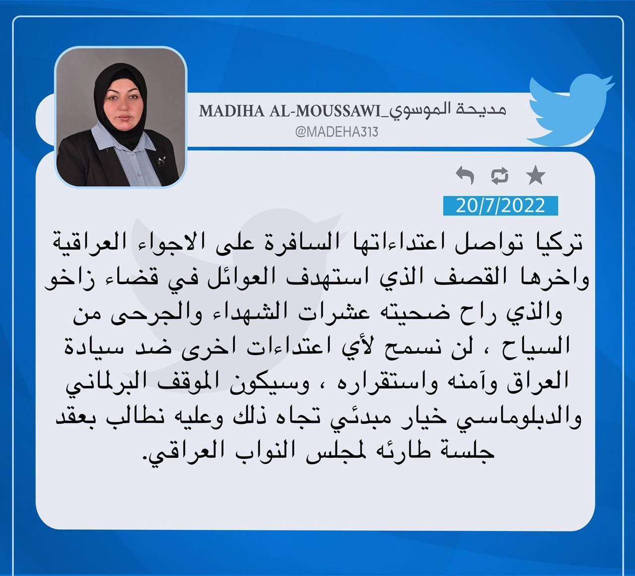 النائب مديحة الموسوي تطالب بعقد جلسة طارئة للبرلمان اثر القصف التركي