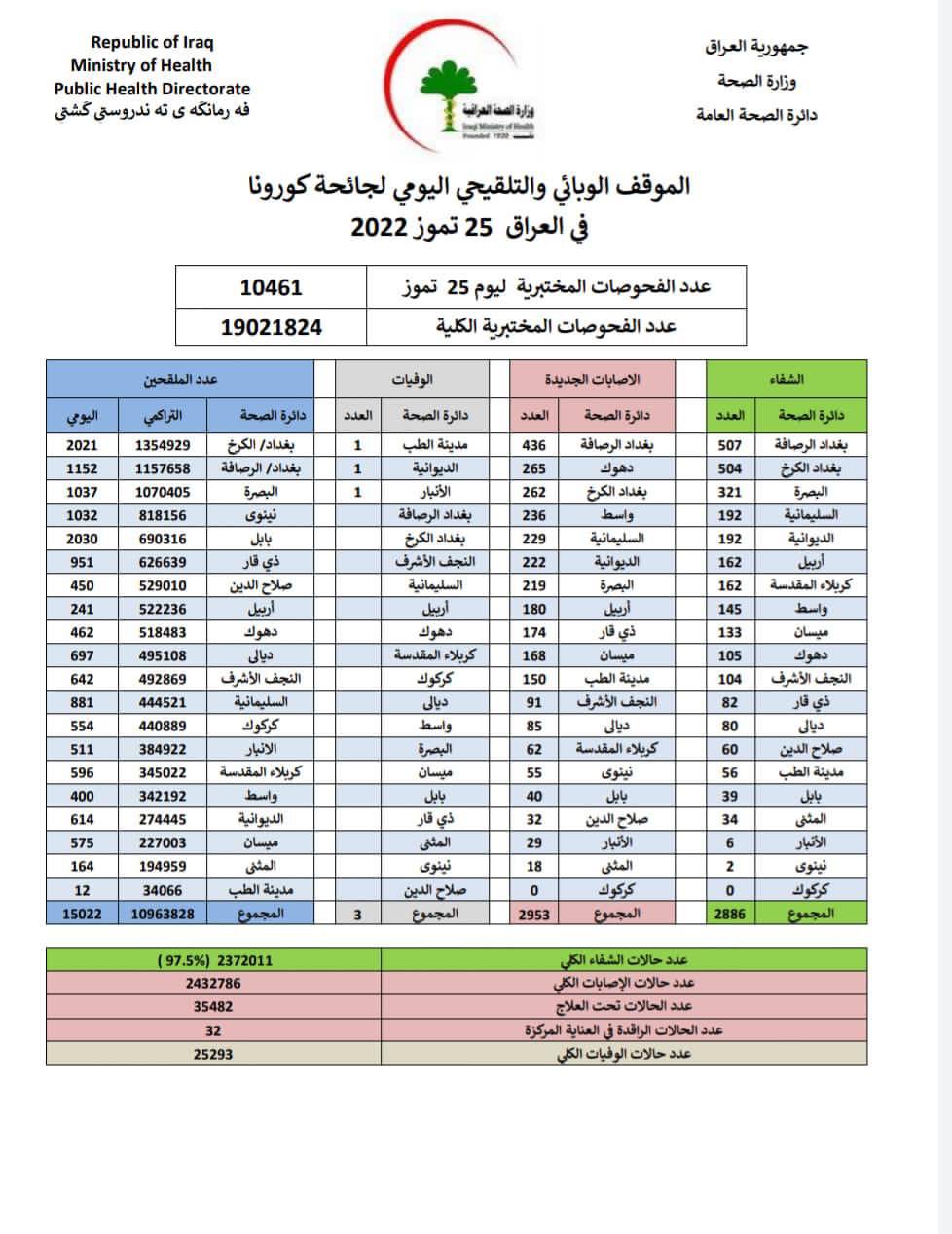 أعلنت وزارة الصحة، اليوم الاثنين، الموقف الوبائي اليومي الخاص بجائحة كورونا في عموم العراق.