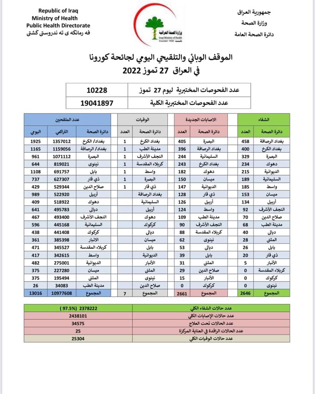 أعلنت وزارة الصحة، اليوم الاربعاء، الموقف الوبائي والتلقيحي لجائحة كورونا في العراق.