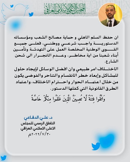 رأى المجلس الأعلى الإسلامي العراقي، اليوم السبت، أن "الاختلاف أمر طبيعي"، فيما دعا إلى "عدم الانجرار إلى شحن الشارع".