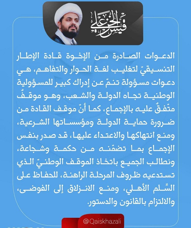 اكد الامين العام لعصائب اهل الحق الشيخ قيس الخزعلي، السبت، ان دعوات قادة الإطار لتغليب لغة الحوار موقف متفق عليه بالاجماع
