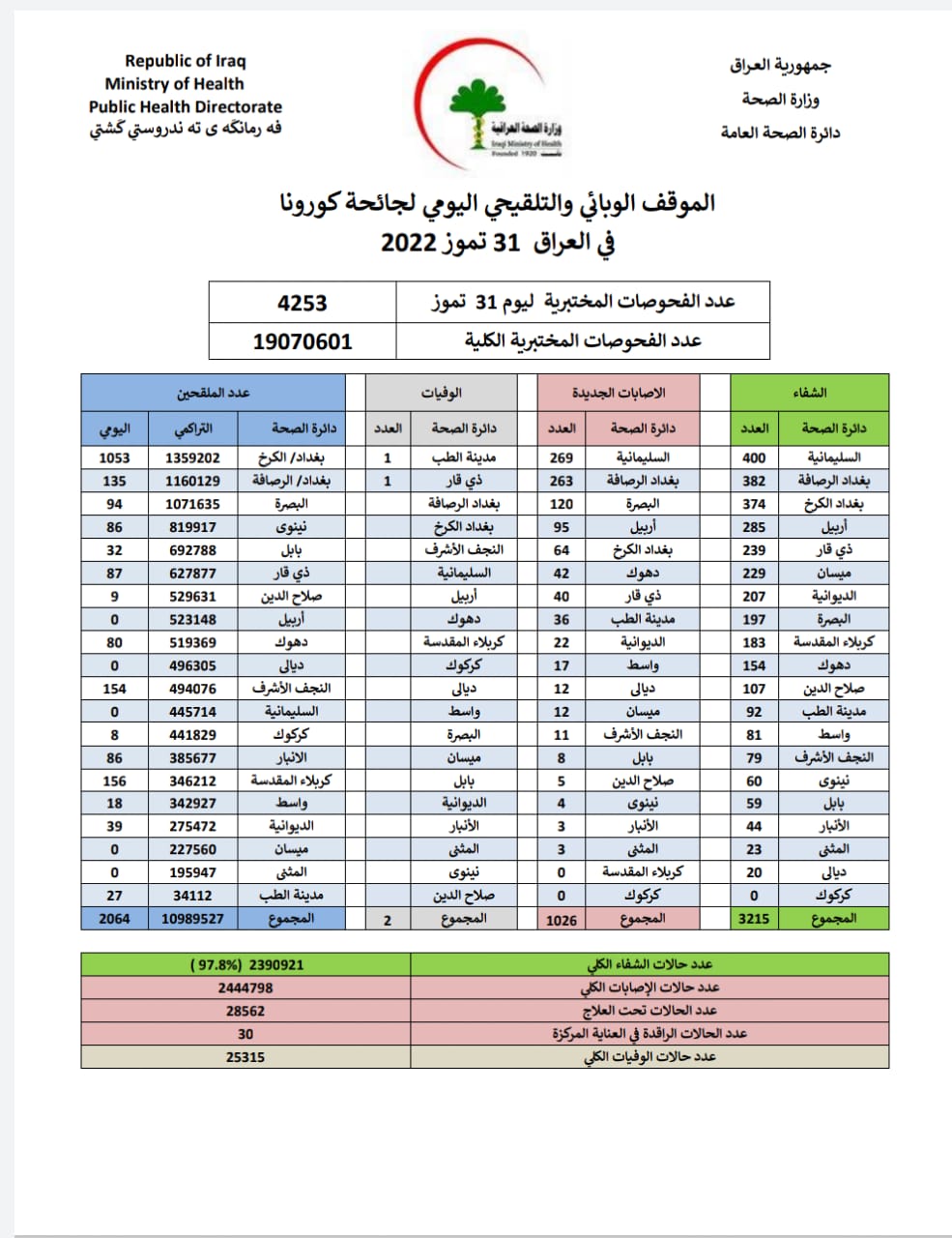 أعلنت وزارة الصحة، اليوم الاحد، الموقف الوبائي والتلقيحي لجائحة كورونا في العراق.