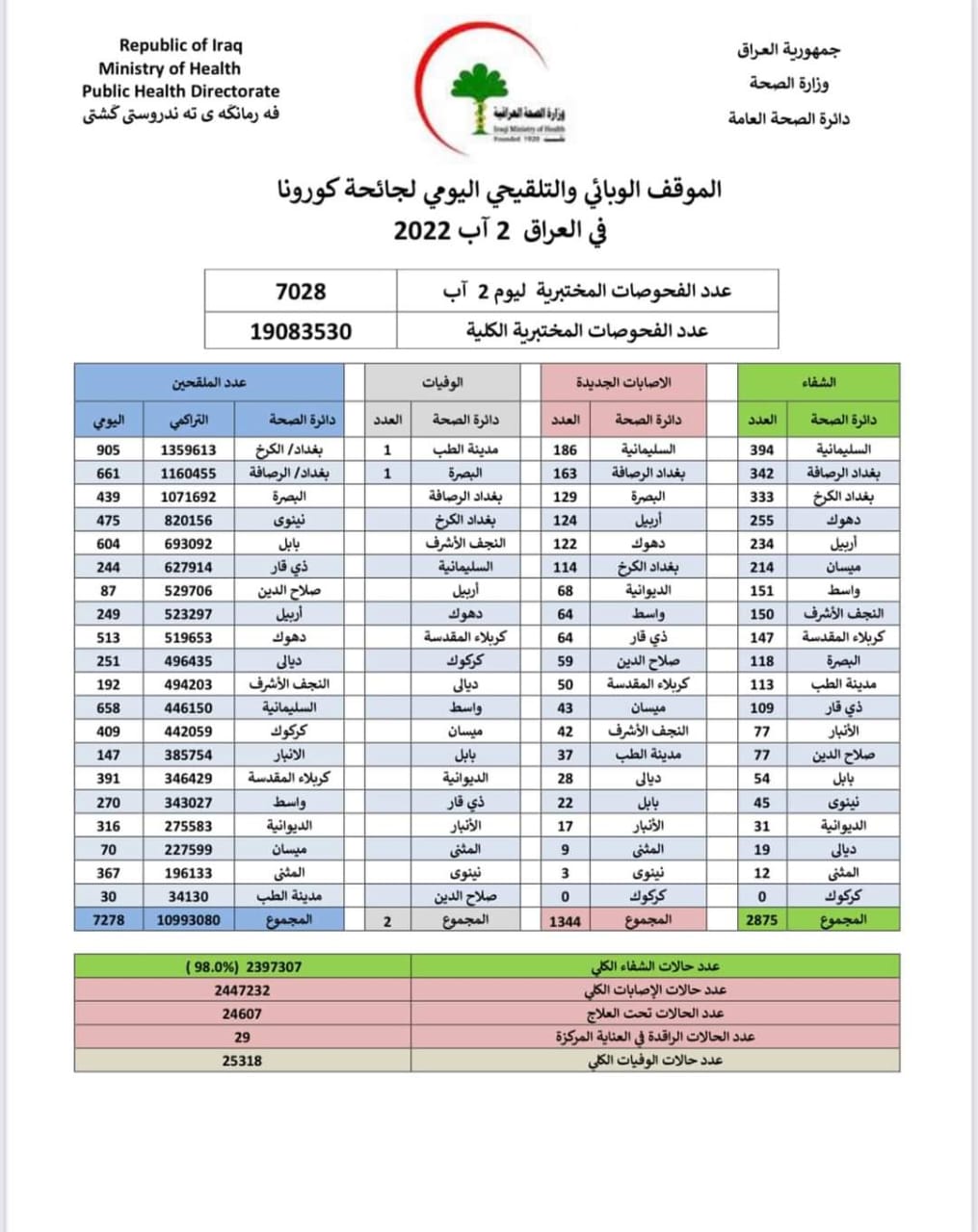 أعلنت وزارة الصحة، اليوم الثلاثاء، الموقف الوبائي اليومي الخاص بجائحة كورونا في عموم العراق.