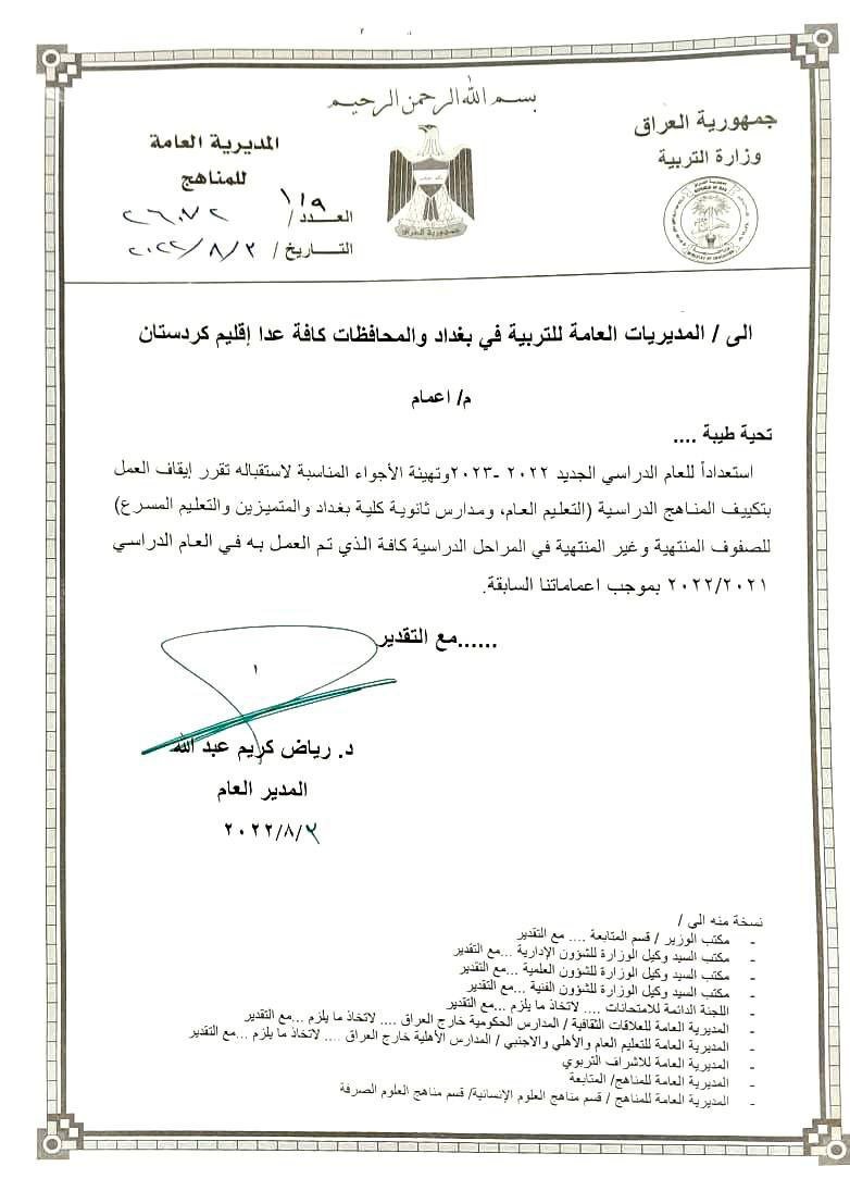 واضافت، أن "المديرية العامة للمناهج اصدرت إعماماً إلى المديريات العامة للتربية في بغداد والمحافظات يقضي بإيقاف العمل بـ"تكييف المناهج الدراسية" (التعليم العام ، مدارس ثانوية بغداد والمتميزين ، التعليم المسرع) للصفوف المنتهية وغير المنتهية في المراحل الدراسية كافة، الذي تم العمل به في العام الدراسي 2021 – 2022 ".