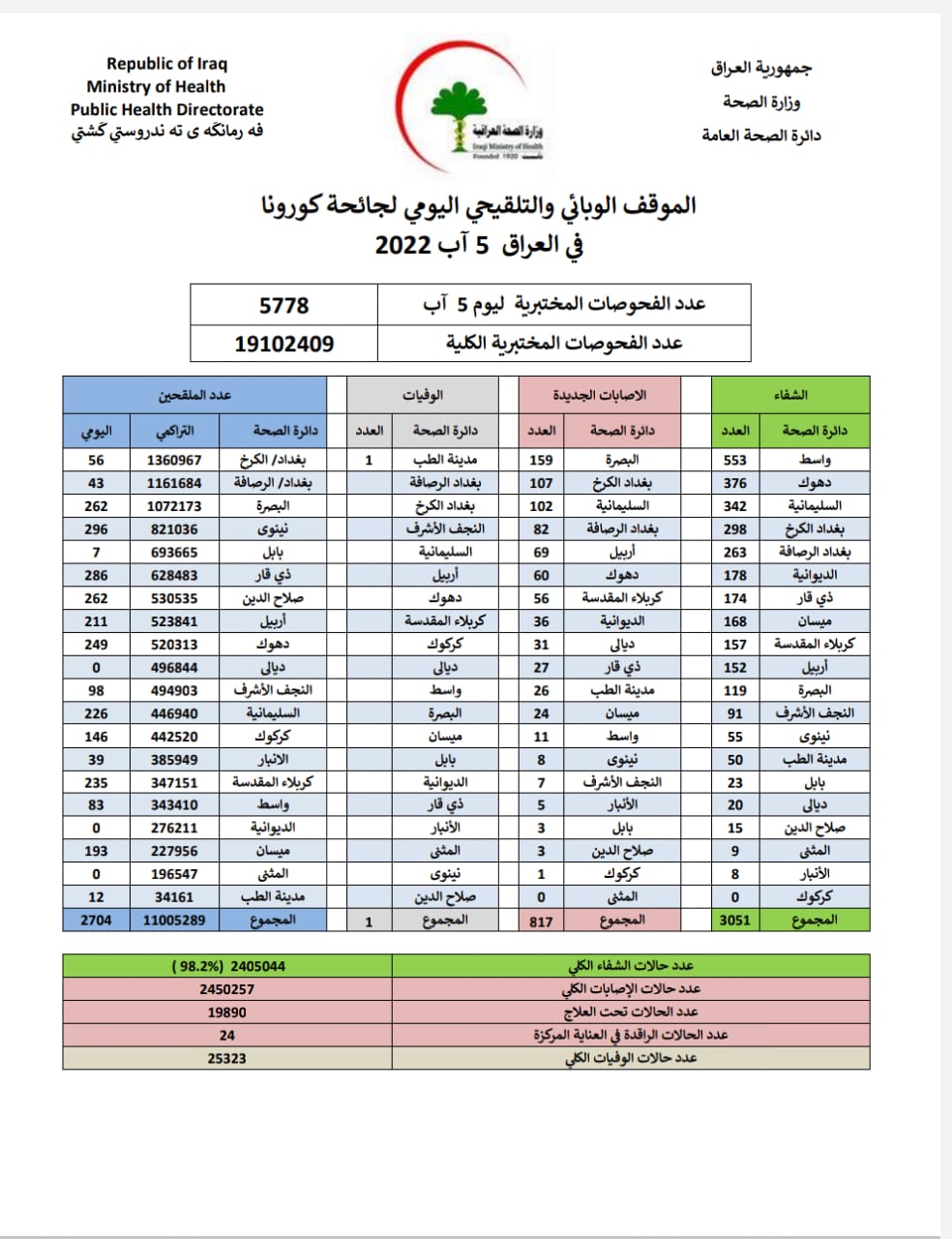 أعلنت وزارة الصحة، اليوم الجمعة، الموقف الوبائي والتلقيحي اليومي لجائحة كورونا في العراق.