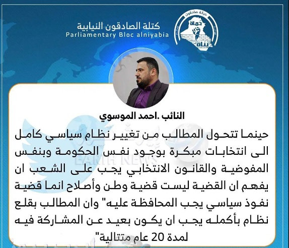 اكد عضو مجلس النواب عن كتلة صادقون احمد الموسوي اليوم السبت، ان تحول المطالب من تغيير النظام الى انتخابات مبكرة يبين ان القضية لا تتعلق بالاصلاح.