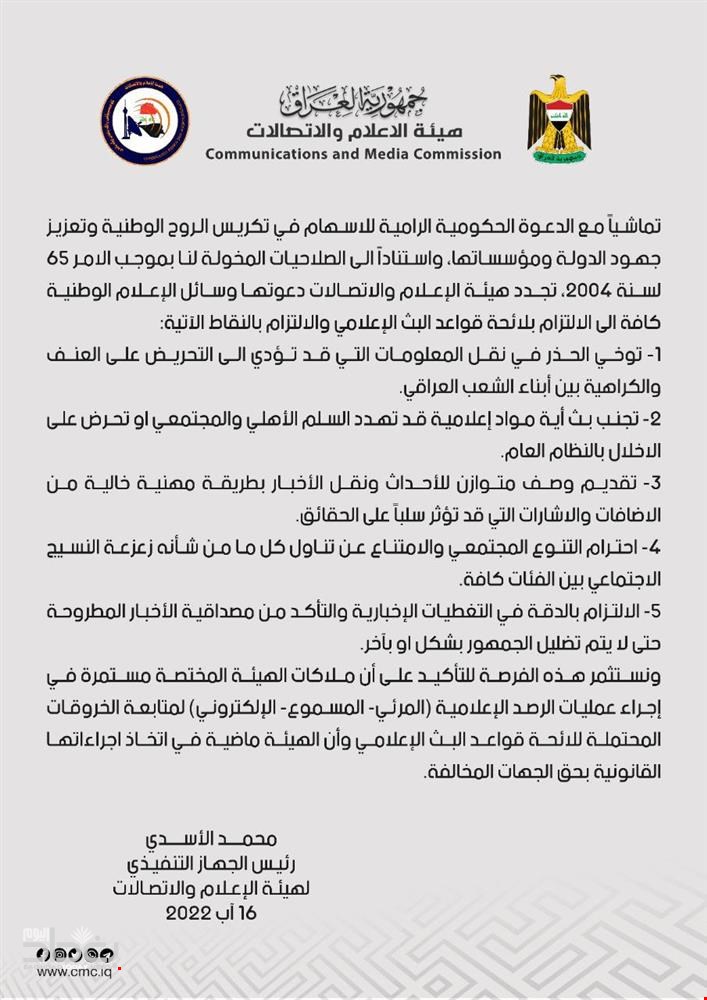 أصدرت هيئة الاعلام والاتصالات، اليوم الثلاثاء، عددا من التوجيهات لوسائل الاعلام فيما يخص نشر الاخبار والمعلومات.