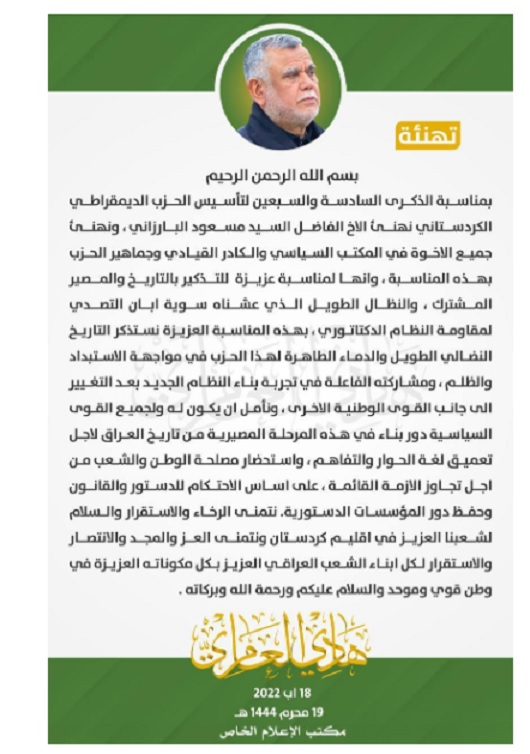 “بمناسبة الذكرى السادسة والسبعين لتأسيس الحزب الديمقراطي الكردستاني نهنئ الاخ الفاضل السيد مسعود البارزاني ، ونهنئ جميع الاخوة في المكتب السياسي والكادر القيادي وجماهير الحزب بهذه المناسبة ، وانها لمناسبة عزيزة للتذكير بالتاريخ والمصير المشترك ، والنضال الطويل الذي عشناه سوية ابان التصدي لمقاومة النظام الدكتاتوري، بهذه المناسبة العزيزة نستذكر التاريخ النضالي الطويل والدماء الطاهرة لهذا الحزب في مواجهة الاستبداد والظلم، ومشاركته الفاعلة في تجربة بناء النظام الجديد بعد التغيير الى جانب القوى الوطنية الاخرى، ونأمل ان يكون له ولجميع القوى السياسية دور بناء في هذه المرحلة المصيرية من تاريخ العراق لاجل تعميق لغة الحوار والتفاهم، واستحضار مصلحة الوطن والشعب من اجل تجاوز الازمة القائمة، على اساس الاحتكام للدستور والقانون وحفظ دور المؤسسات الدستورية.