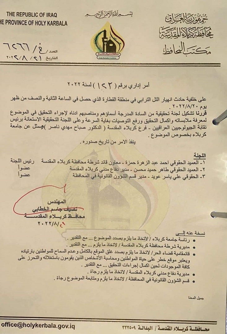 نشرت وثيقة موقعة باسم محافظ كربلاء نصيف الخطابي تتضمن تشكيل لجنة تحقيقية بشأن "حادثة القطارة".