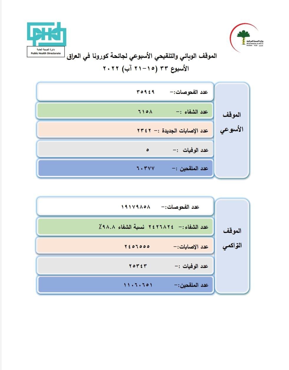 أعلنت وزارة الصحة، اليوم الاثنين، الموقف الوبائي الأسبوعي لجائحة كورونا في عموم العراق.