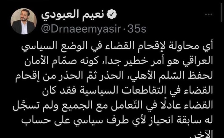 نعيم العبودي: إقحام القضاء في الوضع السياسي الحالي أمر خطير جدا (تغريدة)