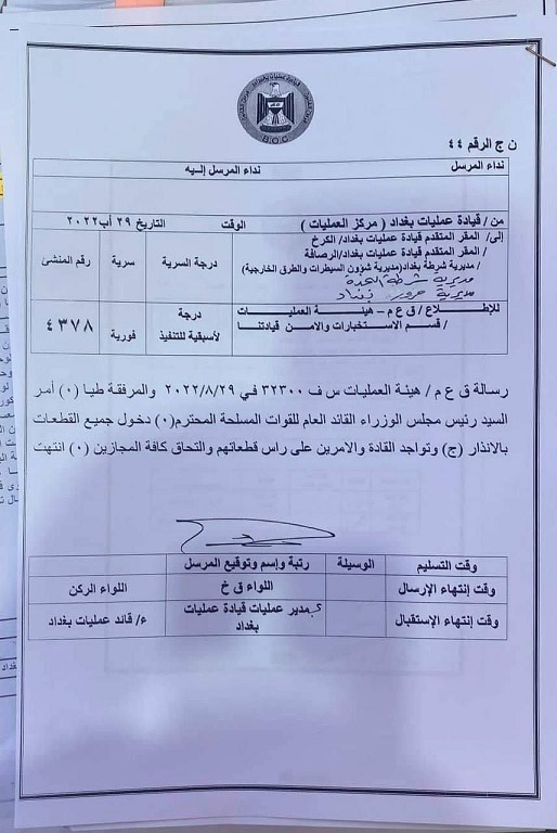 وقال المصدر إن "قيادة عمليات بغداد وجهت جميع المقرات والمديريات بدخول جميع القطعات بالانذار (ج) وتواجد القادة والامرين على رأس قطعاتهم والتحاق كافة المجازين".