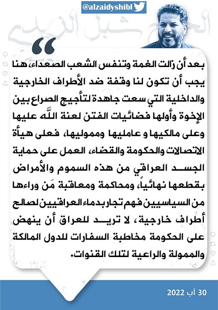 وقال الزيدي في تغريدة، إنه "بعد أن زالت الغمة وتنفس الشعب الصعداء، هنا يجب أن تكون لنا وقفة ضد الأطراف الخارجية والداخلية التي سعت جاهدة لتأجيج الصراع بين الأخوة، وأولها فضائيات الفتن".