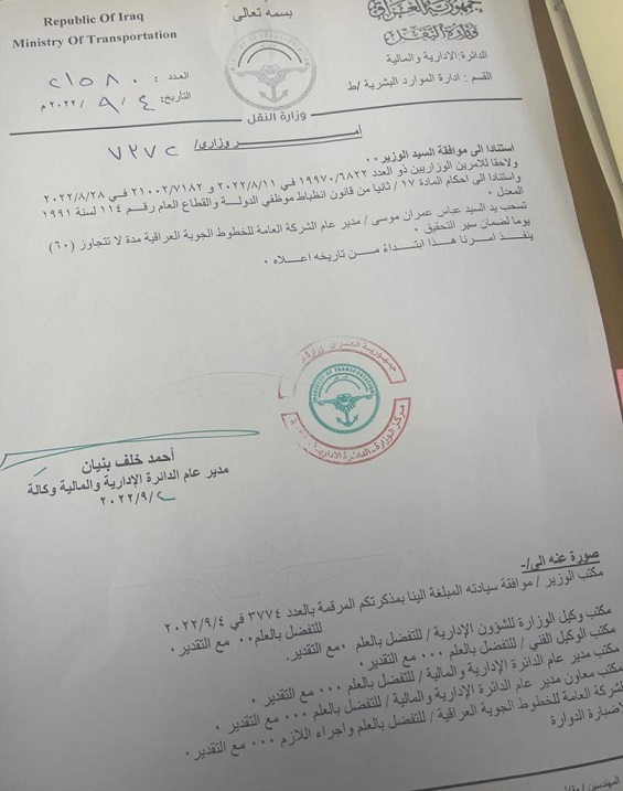 واظهرت وثيقة صادرة عن الوزارة ، انه "استنادا الى موافقة وزير النقل تقرر سحب يد عباس عمران موسى، مدير الشركة العامة للخطوط الجوية العراقية مدة لا تتجاوز 60 يوما لضمان سير التحقيق".