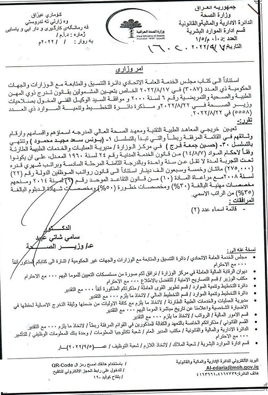 وبحسب وثيقة تضمنت “استنادا الى كتاب مجلس الخدمة الاتحادي الخاص بتعيين المشمولين بقانون تدرج ذوي المهن الطبية والصحية والتمريضية وموافقة وزير الصحة هاني موسى العقابي أصدرت الدائرة الادارية والمالية والقانونية في وزارة الصحة أمر وزاري بتعيين خريجي المعاهد الطبية التقنية ومعهد الصحة العالي في مركز الوزارة/ مديرية العمليات والخدمات الطبية الطارئة”