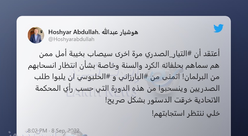 رجح السياسي الكردي هوشيار عبدالله، اليوم الخميس، بأن يُصاب التيار الصدري يخيبة أمل من السنة والكرد.