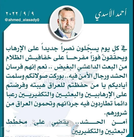 اكد رئيس تجمع السند الوطني احمد الاسدي اليوم الجمعة ان الحشد الشعبي قضى على مخطط البعثيين والتكفيريين.