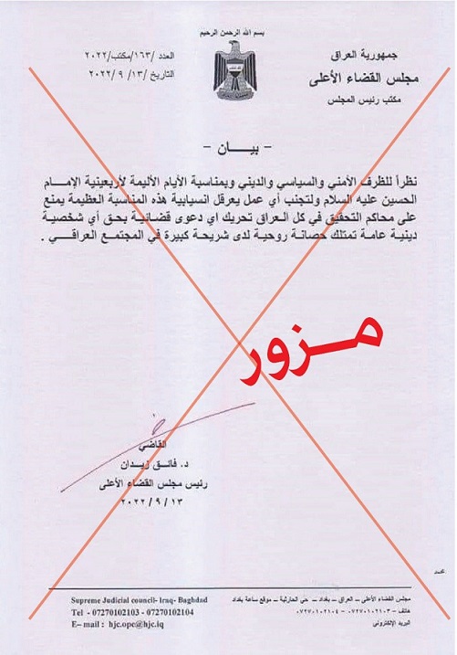 وقال المكتب الإعلامي للمجلس في بيان مقتضب ، "ننفي صدور أي وثيقة فيها توجيهات للمحاكم تخص الشخصيات الدينية وما ظهر على مواقع التواصل غير صحيح ومزور".