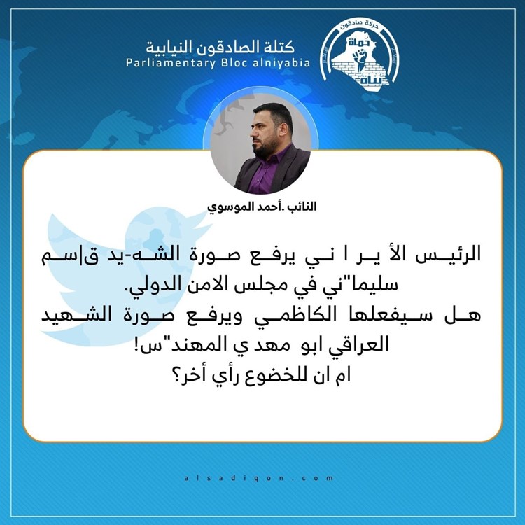 النائب احمد الموسوي مغردا ... هل سيرفع الكاظمي صورة المهندس كما فعل الرئيس الايراني برفعه صورة سليماني في الامم المتجدة