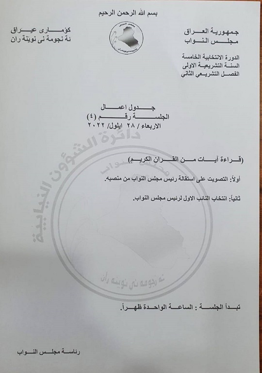 وبحسب وثيقة صادرة عن رئيس البرلمان، فإن "مجلس النواب سيعقد جلسته الرابعة يوم الأربعاء المقبل، 28 أيلول 2022".
