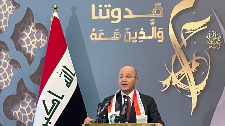 ونوه إلى أن "موقعُ العراق الجغرافيُّ في قلب المِنطَقة يجب أن يكونَ جسراً للتواصل ومركزاً اقتصاديّاً وتجاريّاً وثقافيّاً، لا أن يكونَ محوراً وساحة صراعاتِ الآخرين"، مضيفاً أن "العراقيين يصرّون على وطن له سيادة كاملة يعيشُ في أمنٍ مع شعبهِ ومع جيرانهِ وأخذُ مكانتهُ الحضاريةَ في المِنطَقة والعالم".
