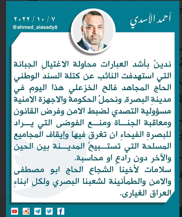 النائب احمد الاسدي يدين محاولة اغتيال الخزعلي ويحمل الحكومة مسؤولية معاقبة الجناة