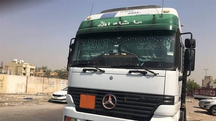 ضبطت قوة أمنية، اليوم الاحد، "تريلة" بداخلها أعلام سعودية وصور صدام حسين في العاصمة بغداد.