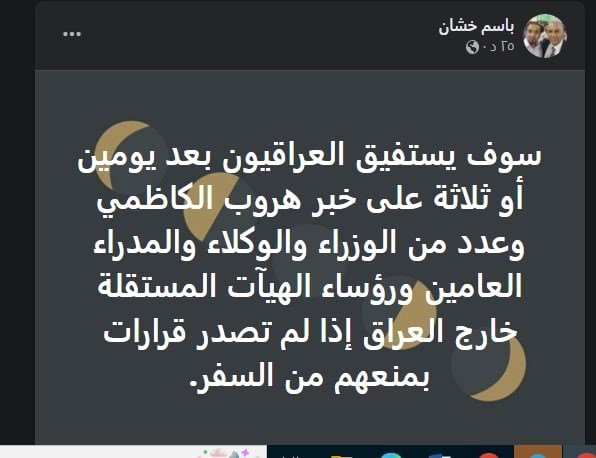 باسم خشان: ثلاثة أيام وسيهرب الكاظمي ووزرائه ووكلائه الى خارج العراق