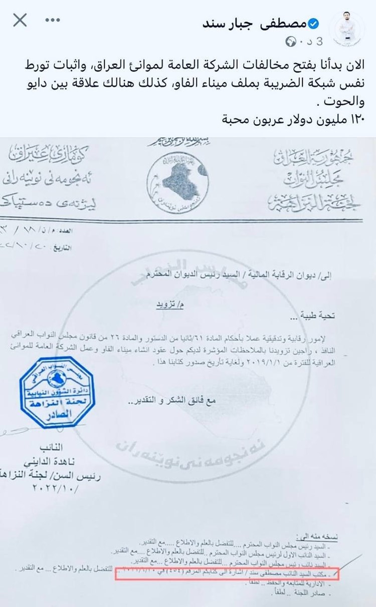 مصطفى سند يفتح ملف موانئ العراق: 120 مليون دولار عربون محبة