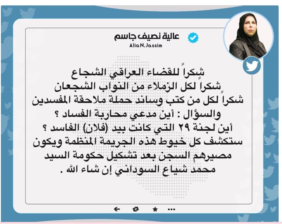 نصيف تغمز الكاظمي: اين لجنة 29 التي كانت بيد فلان الفاسد؟!